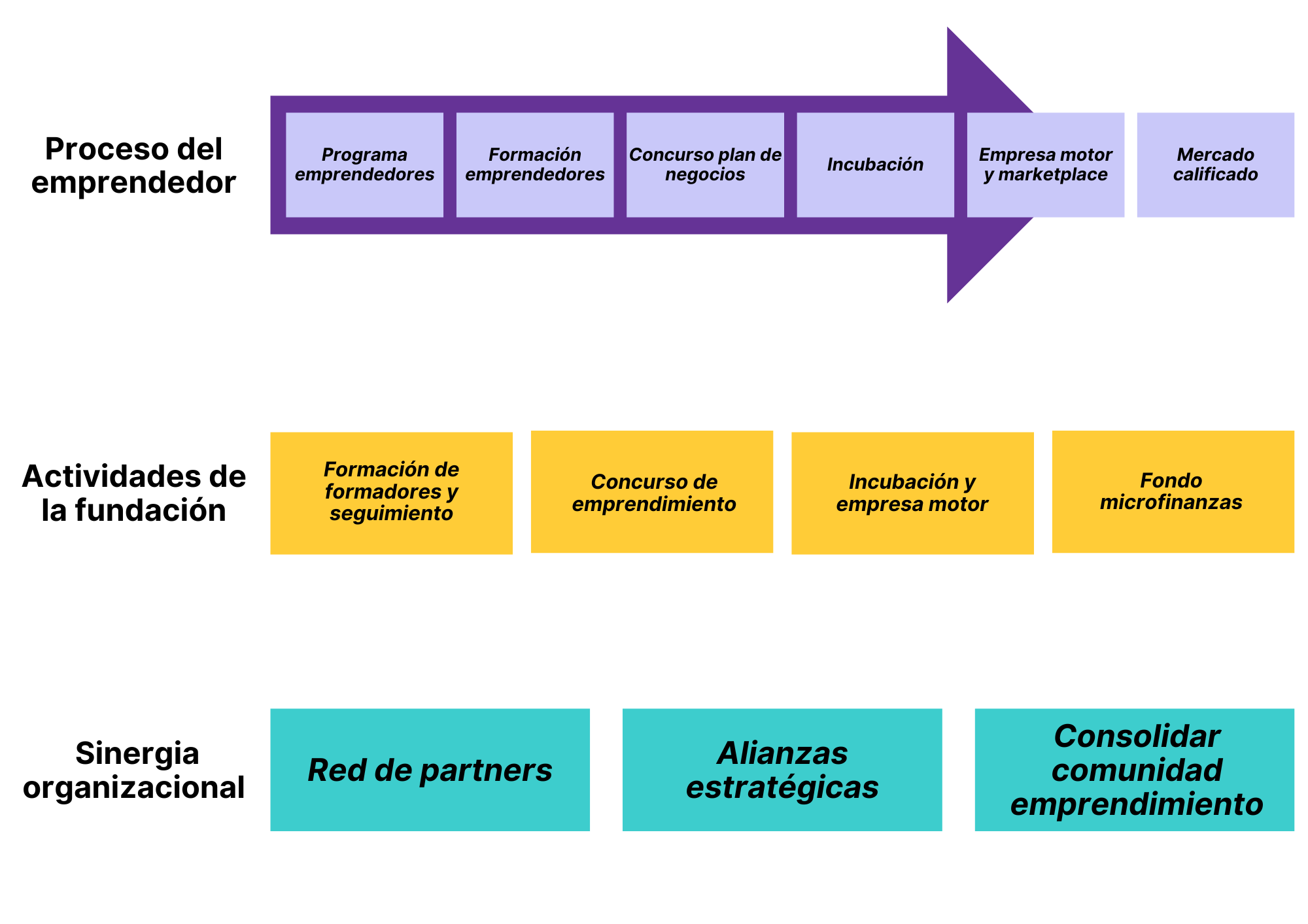 Mejorar calidad de vida de jóvenes y familias en condición de pobreza y vulnerabilidad, apoyados en la consolidación de un modelo de emprendimiento e innovación sostenible que integre el sistema educativo y el mundo productivo, mediante el desarrollo de contenidos, software, cursos e-learning, talleres, formación de formadores y textos educativos lúdicos de excelente calidad. Así como, la creación de empresas Motor o empresas “jalonadoras” que educan, incuban, empoderan y preparan a los pequeños negocios para insertarse en grandes mercados, ofreciéndoles asesoría, acompañamiento y servicios de microfinanzas. Lo anterior, enmarcado en valores éticos, la integridad, el desarrollo sostenible, el comercio justo y el desarrollo humano de personas y comunidades.